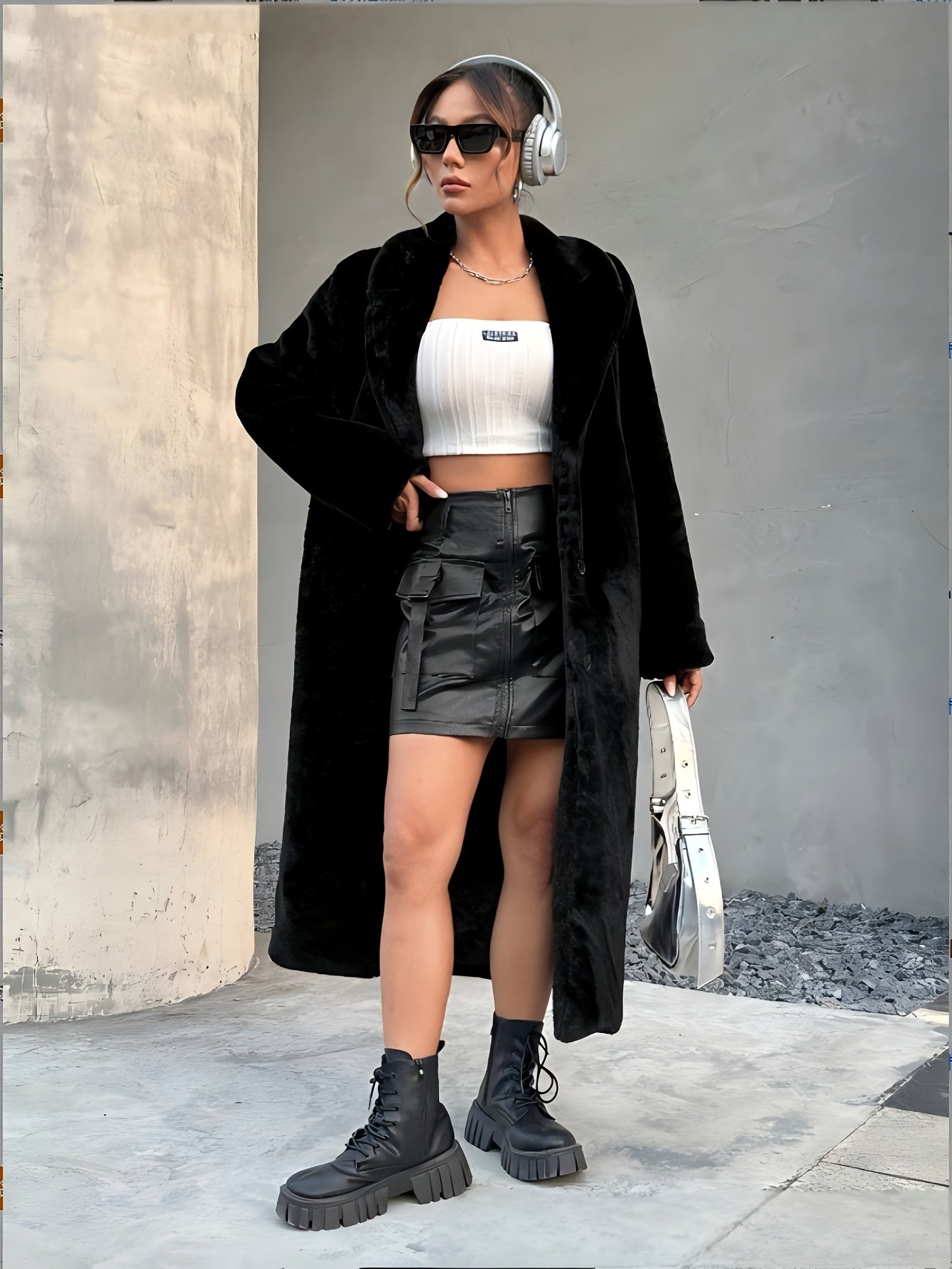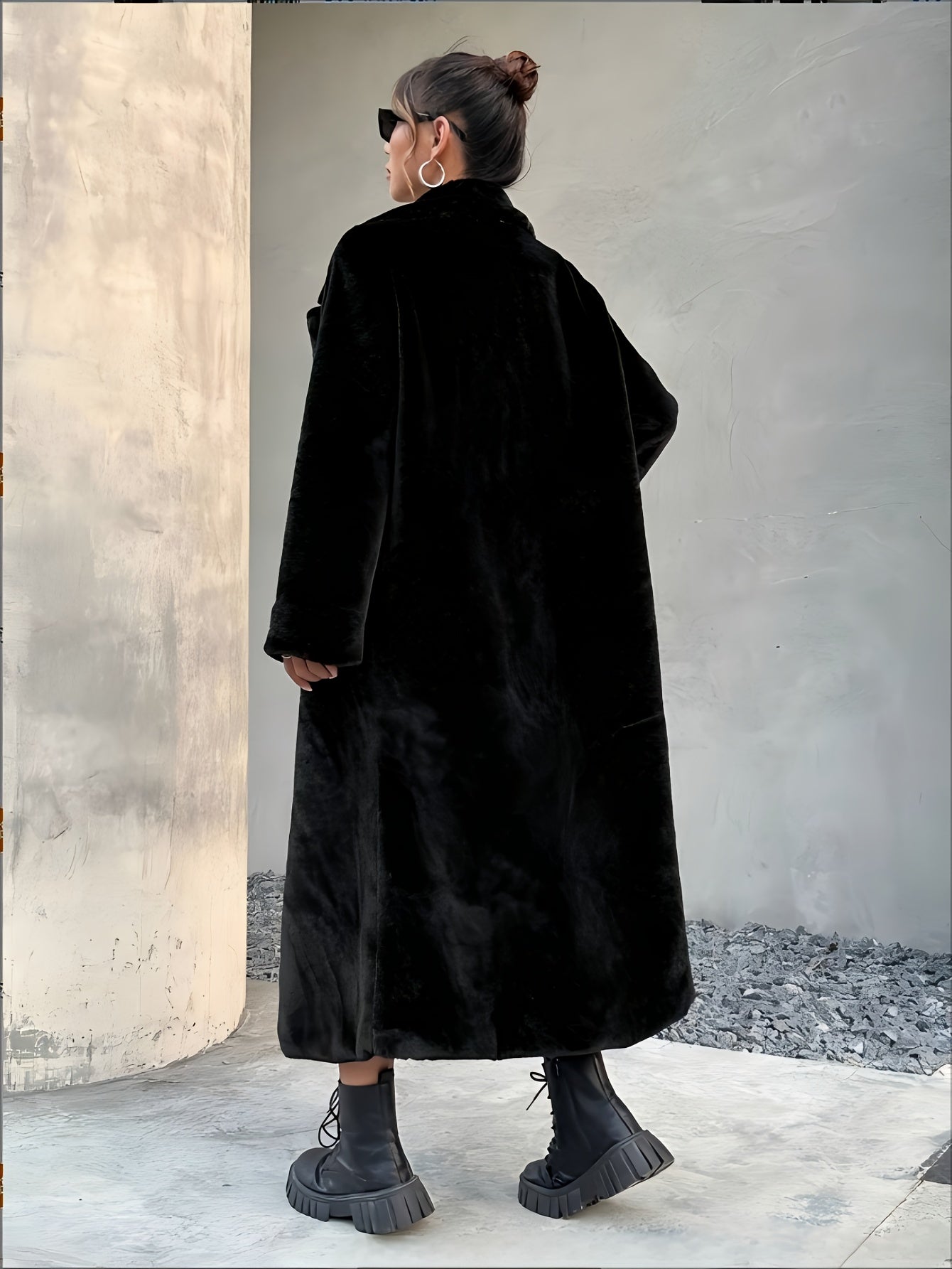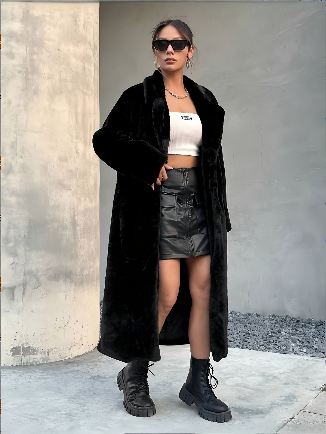 Lång svart fuskpälsjacka